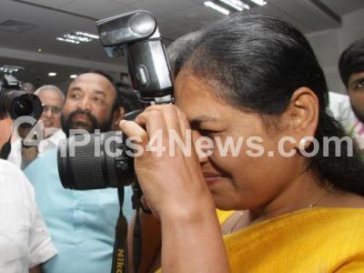 Photo Caption : Former Minister Shobha Karanlaje seen taking a picture during the Dr BR Ambedkar Jayanthi program at BJP party Office in Malleswaram, in Bengaluru on Thursday 14th April 2016