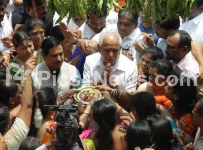 Photo Caption : Former CM BS Yedduyurappa being greeted by BJP workers on arrival for taking charge as the BJP state president, in the presence of past President Pralhad Joshi at the BJP party Office in Malleswaram, in Bengaluru on Thursday 14th April 2016
