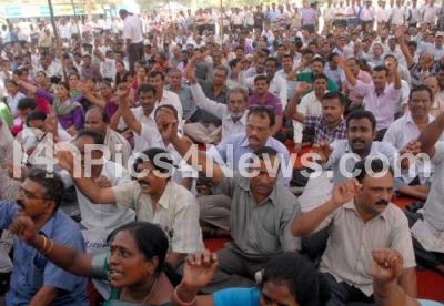 Photo Caption : 2nd Pre University evaluation teachers protesting against the state government to fulfill their various demands at Freedom Park, in Bengaluru on Friday 15th April 2016