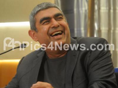 Photo Caption : Infosys CEO Vishal Sikka addressing a press conference to announce company annual financial result at infosys campus, in Bengaluru on Friday 15th April 2016