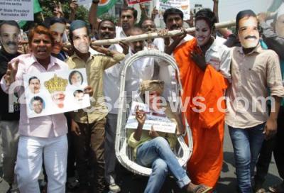 Event Description : Indian Youth Congress seen protesting in a unique way against state BJP for appointing BS Yeeduyurappa as the Karnataka BJP president, the protest was held at Anand Rao Circle, in Bengaluru on Saturday 16th April 2016