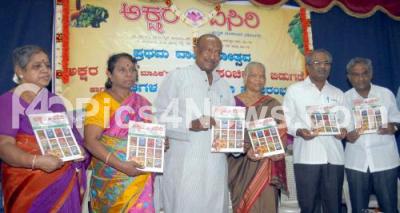Photo Caption : Ram K Hanumantaiah, President, Kannadigara Snehakuta with Gangamma Keshavamurthy, President, Karnataka Sangeeta and Nritya Academy, Poet Jaraganahallia Shiva Shankar, Padmavati Chandru and S Vijaya Gururaja at the release of "Akshara Isiri" book at Kannada Sahitya Parishat, in Bengaluru on Sunday 17th April 2016