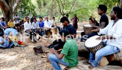Photo Caption : Artist John Devraj along with his troupe performs as the gathering cheers during the Art Walk at Sculpture Park, as part of the anniversary of Venkatappa Art Gallery, in Bengaluru on Sunday 17th April 2016
