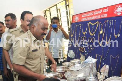 Photo Caption : Bengaluru South DCP BS Lokesh Kumar with Chamarajpet ACP Syed Isak inspecting recovered jewels and cash which were recovered from the accused Manjunath and his team by Hanumanthnagar Police personal, in Bengaluru on Monday 18th April 2016