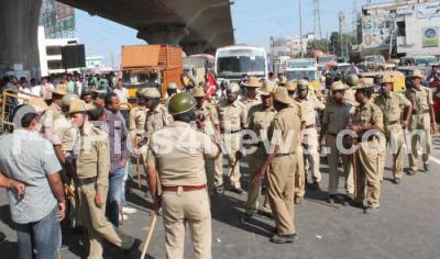 Photo Caption : Garment workers protest caused huge traffic jam on Hosur road who blocked the road hours together causing inconvenience to the commuters, a flash protest by thousands of garment workers, at Bommanahalli junction since morning, turned violent with over some protesters getting injured in the clash with cops on Monday in Bengaluru, the garment workers are protesting the central governments decision on withdrawal of provident funds, which has set April 30 as deadline, in Bengaluru on Monday 18th April 2016