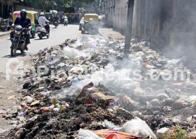 Photo Caption : Garbage caught fire at Bharati Nagar causing problems to the motorists and the residents, in Bengaluru on Wednesday 20th April 2016
