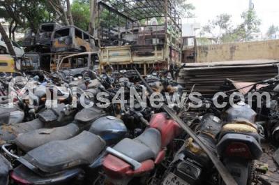 Photo Caption : Burnt Vehicles during the protests by Garment Workers against the Central Government seen parked outside the Hebbagodi police station on Hosur Road, in Bengaluru on Wednesday 20th April 2016