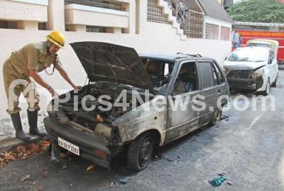 Photo Caption : Cars were found burnt due to short circuit and excess heat at okalipuram, fire perssonel were pressed into action to dose off the fire, in Bengaluru on Saturday 23rd April 2016