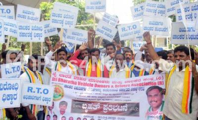 Photo Caption : Members of Jaibharath Vehicle Owners and Drivers Association protesting and demanding to fulfill their various demands at Gandhi Statue , in Bengaluru on Friday 30th April 2016