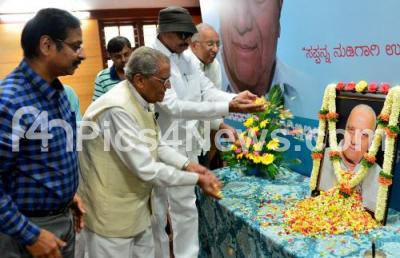Photo Caption : Senior Congress leader MV Rajashekaran with Vatal Nagaraj and others floral tribute to the portrait of Jayasheel Rao, during the remembrance program at Gandhi Bhavan, in Bengaluru on Friday 6th May 2016