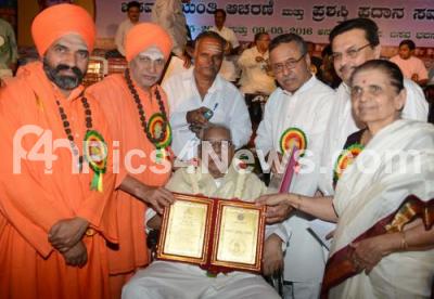 Photo Caption : Prof SS Arakeri being presented with Basava Award 2016 by Arvind Jatti, Chairperson, Basava Samiti, Shivarudra Mahaswamy and others on the occasion of Basava Jayanthi at Basava Bhavan, in Bengaluru on Monday 9th May 2016