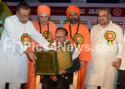 Photo Caption : Prof IG Sanadi being presented with Basava Award 2016 by Arvind Jatti, Chairperson, Basava Samiti, Shivarudra Mahaswamy and others on the occasion of Basava Jayanthi at Basava Bhavan, in Bengaluru on Monday 9th May 2016
