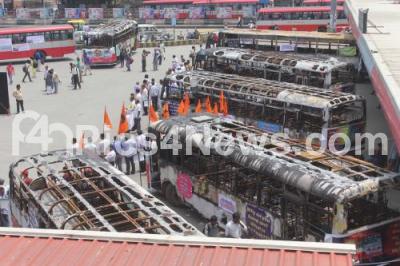 Photo Caption : Burnt and destroyed buses in riots being showcased during the awareness campaign “It is My Busâ€, featuring street plays, exhibition of remains of burnt buses, painting of the buses by artist Badal Nanjundaswamy were being showcased at Kempegowda Bus Stand, organised by Transport Department, in Bengaluru on Tuesday 10th May 2016