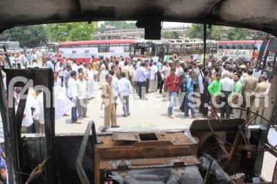 Event Description : Burnt and destroyed buses in riots being showcased during the awareness campaign “It is My Bus”, featuring street plays, exhibition of remains of burnt buses, painting of the buses by artist Badal Nanjundaswamy were being showcased at Kempegowda Bus Stand, organised by Transport Department, in Bengaluru on Tuesday 10th May 2016