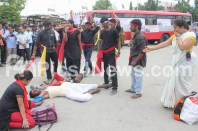 Burnt and destroyed buses in riots being showcased during the awareness campaign “It is My Bus”, featuring street plays, exhibition of remains of burnt buses, painting of the buses by artist Badal Nanjundaswamy were being showcased at Kempegowda Bus Stand, organised by Transport Department, in Bengaluru on Tuesday 10th May 2016