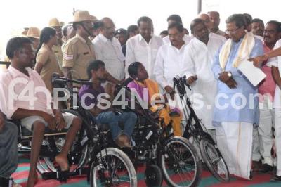 Chief Minister Siddaramaiah with Ministers Dr G Parameshwar, H Anjaneya and others laid the foundation stone for district offices complex and distributed cycles to disabled people at Beerasandra Village in Devanahalli Taluk on Friday 13th May 2016