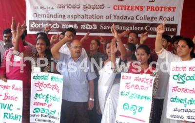 Event Description : Members of Save Bangalore Committee and students of Yadava college holding a Citizens protest demonstration demanding asphaltation of Yadava college Road near Shivananda Circle under bridge which connects Race Course Road at Gandhi Statue, in Bengaluru on Friday 13th May 2016