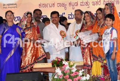 Event Description : CM Siddaramaiah with Minister Parameshwar Naik distributing cheques to beneficiaries during the inauguration of the Rajiv Gandhi Kaushalya Bhavan and Kalyana Suraksha Bhavan at ITI premises at Dairy Circle, in Bengaluru on Saturday 14th May 2016