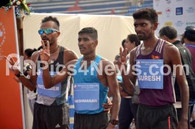 Photo Caption : Indian Men Winner Suresh, 2nd runner Nitendra Singh and 3rd runner Lakshmanan celebrate, during TCS World 10K Bengaluru 2016, in Bengaluru on Sunday 15th May 2016