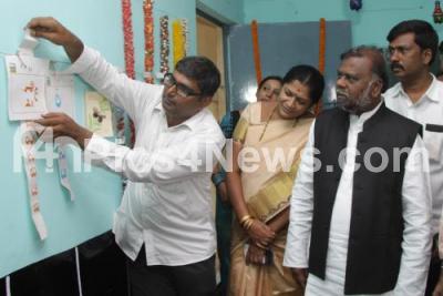Photo Caption : Minister H Anjaneya with Deputy Mayor Hemalatha Gopalalaiah seen going through the art exhibition made of trash and waste material and to decorate the government schools with the same art material on the occasion 3rd anniversary celebrations of Art of Giving, organised by Kalinga Institute of Social Sciences, the program was held at Government Higher Primary School at Kurubarahalli, in Bengaluru on Tuesday 17th May 2016