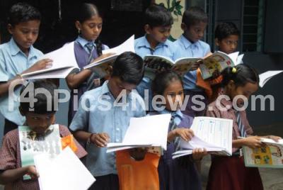 Photo Caption : Students of Government Higher Primary School at Kurubarahalli seen reading their new books, which were distributed by Minister H Anjaneya, on the occasion 3rd anniversary celebrations of Art of Giving, organised by Kalinga Institute of Social Sciences, in Bengaluru on Tuesday 17th May 2016