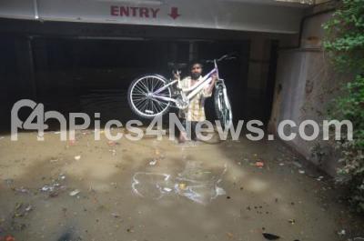Photo Caption : A man seen carrying his bicycle which was stuck with many cars and bikes in the basement of the apartment at JP Nagar 1st Phase after the last night rainfall, fire personnel were pressed into action to drain the rain water out as many vehicles were stuck in the basement of the apartment, in Bengaluru on Friday 20th May 2016