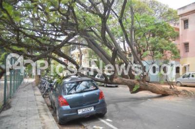 Photo Caption : A tree uprooted and fell on car at BTM Layout 2nd stage due to the last night heavy rainfall, in Bengaluru on Friday 20th May 2016