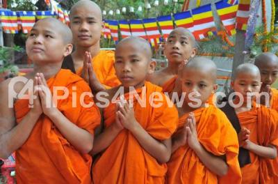 Photo Caption : Young Buddhist monks seen praying on the occasion of 2560th sacred Buddha Jayanthi Celebrations 2016 at Maha Bodhi Society, Gandhinagar, in Bengaluru on Saturday 21st May 2016