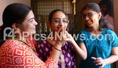 Rakshitha T, 1st rank in science from VVS Sardar Patel PU college in Basaweshwarnagar seen celebrating with her mother and sister after the 2nd PU results were announced, in Bengaluru on Wednesday 25th May 2016
