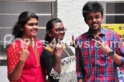Photo Caption : Deeksha Nayak, 3rd rank seen with Shreya and Vivek, toppers from Jain collage celebrate after the 2nd PU results were announced at Jain collage, VV Puram, in Bengaluru on Wednesday 25th May 2016