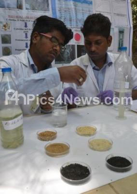 Photo Caption : Students Abhishek and Mohammed Athiq seen demonstrating a water test and presented a effective solution to Bellandur Lake menace during a press conference at Press Cub, in Bengaluru on Saturday 28th May 2016