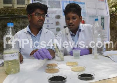 Photo Caption : Students Abhishek and Mohammed Athiq seen demonstrating a water test and presented a effective solution to Bellandur Lake menace during a press conference at Press Cub, in Bengaluru on Saturday 28th May 2016