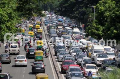Photo Caption : An experiment by the Bengaluru Traffic Police to decongest the road to the airport by changing the flow of traffic went wrong on Saturday, as the new rules led to severe traffic jam at Mekhri Circle, Windsor Circle, Basava Bhavan Junction and surrounding areas, in Bengaluru on Saturday 28th May 2016