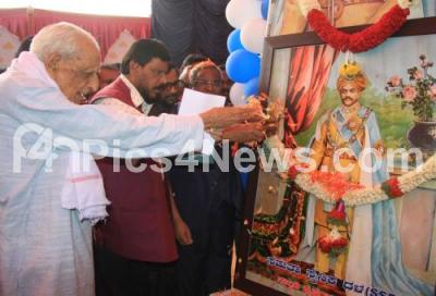 Photo Caption : HS Doreswamy with Ramdas Athawale, President, Republican Party of India, Dr M Venkataswamy and members of Samatha Sainik Dal floral tribute to the portrait of Nalwadi Krishnaraja Wodeyar on the 132nd Jayantotsava at Freedom Park, organised by Samatha Sainik Dal, in Bengaluru on Saturday 4th June 2016