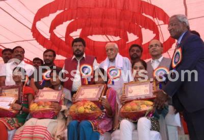 Photo Caption : HS Doreswamy with Ramdas Athawale, President, Republican Party of India, Dr M Venkataswamy and members of Samatha Sainik Dal felicitating the Dalit SSLC student toppers on the occasion of 132nd Jayantotsava of Nalwadi Krishnaraja Wodeyar at Freedom Park, organised by Samatha Sainik Dal, in Bengaluru on Saturday 4th June 2016