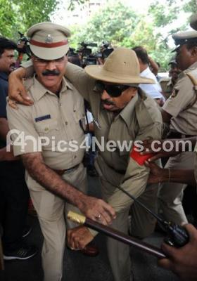 Vatal Nagaraj, Kannada Activist, dressed as a policeman, was taken under preventive custody, as he tried to stage a protest at Basaveshawara Circle, to support the police personnel, who threatened to go on mass leave and protest, in Bengaluru on Saturday 4th June 2016