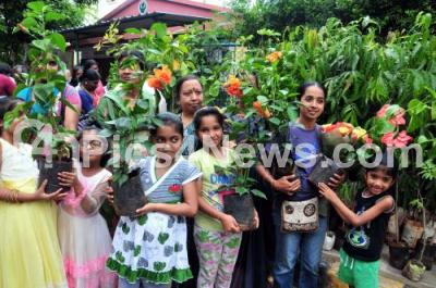 Photo Caption : Children and their parents carrying plants which were donated by Haisru Madilu at Jayanagar, in Bengaluru on Sunday 5th June 2016