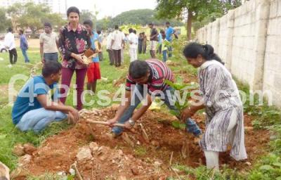 Photo Caption : Volunteers and people from all walks of life plant sapling during a planting drive organised by Whitefield Rising at Ramagondanahalli Government School, near Varthur, in Bengaluru on Sunday 5th June 2016