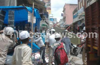 Event Description : The Banagalore City Traffic Police with the help of BBMP force removing the illegal encroachments on footpath and roads in Jumma Masjid Road and around Russel Market by Shop owners, vendors and hawkers, who have brazenly put their wares on roads blocking easy movement of vehicles and pedestrians, in Bengaluru on Tuesday 7th June 2016