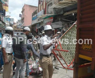Event Description : The Banagalore City Traffic Police with the help of BBMP force removing the illegal encroachments on footpath and roads in Jumma Masjid Road and around Russel Market by Shop owners, vendors and hawkers, who have brazenly put their wares on roads blocking easy movement of vehicles and pedestrians, in Bengaluru on Tuesday 7th June 2016