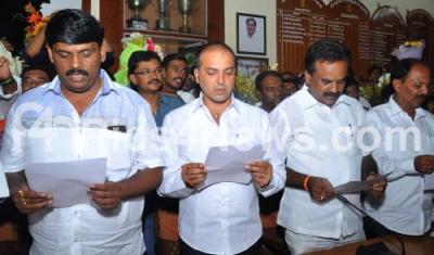 Photo Caption : Newly nominated councilors taking oath in the presence of Mayor Manjunath Reddy at BBMP, in Bangalore on 8th June of 2016