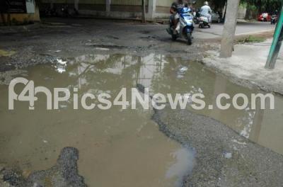 Photo Caption : Bengaluru has become a city of potholes after the recent rainfall, the Bengaluru city roads have gone worse, as the city roads have crater like potholes and the rain water is logged in these huge potholes causing problems to the motorists at Benson Road Cross, in Bengaluru on Thursday 9th June 2016