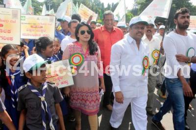 Photo Caption : Minister Parameshwar Naik with Actors Pooja Gandhi, Vinay Rajkumar and School Students partake in awareness rally on the occasion of World against Child Labour Day at Kanteerava Stadium, in Bengaluru on Sunday 12th June 2016