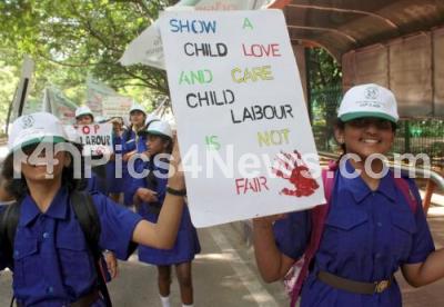 Photo Caption : School Students partake in awareness rally on the occasion of World against Child Labour Day at Kanteerava Stadium, in Bengaluru on Sunday 12th June 2016