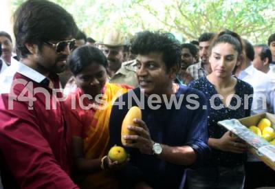 Event Description : Actors Shivarajkumar with Yash and Ragini Diwedi and others taste the mango fruits during "Mango Picking Tourism" at Cubbon Park, in Bengaluru on Sunday 12th June 2016