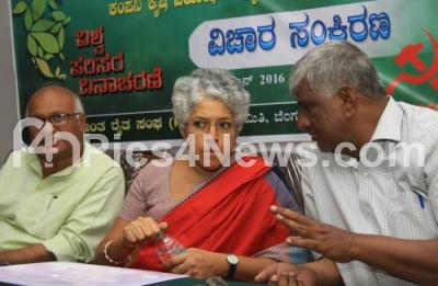 Photo Caption : Prof Madhura Swaminathan with GC Bayya Reddy, Vice President, Karnataka Prantha Raitha Sangha and Basavaraj seen at the seminar on World Environment Day at Legislative House, in Bengaluru on Wednesday 15th June 2016