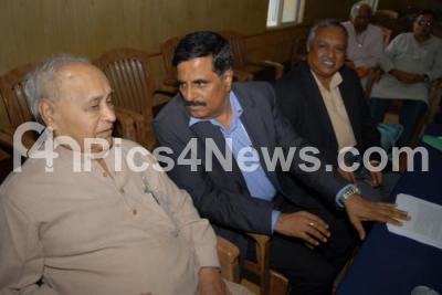 Photo Caption : Justice Rama Jois seen with Manu Baligar, President, Kannada Sahitya Parishat and Justice Nagamohan Das seen at the discussion program on the Supreme Court Judgment on the medium of Instruction at Kannada Sahitya Parishat, in Bengaluru on Wednesday 15th June 2016