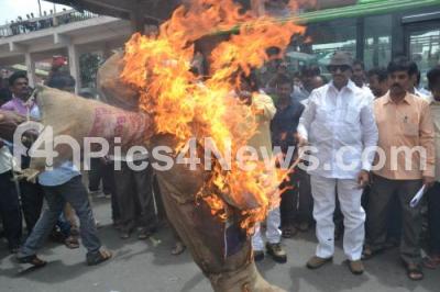 Event Description : Vatal Nagaraj seen burning the effigy of Tamil Nadu CM Jayalalitha in protest for objecting the Mekedatu Project at Majestic Bus Stand, in Bengaluru on Thursday 16th June 2016