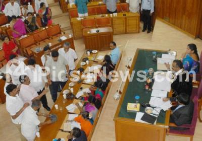 Photo Caption : BJP councilors seen protesting during the BBMP Council Session at BBMP, in Bengaluru on Thursday 16th June 2016