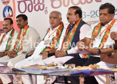 Photo Caption : BS Yeddyurappa, BJP Karnataka State President with Union Ministers Ananth Kumar, DV Sadananda Gowda, P Muralidhar Rao, Bjp Karnataka In Charge, BJP leaders Jagadeesh Shettar and others seen at the BJP State Executive Committee Meeting at Hotel Woodlands, in Bengaluru on Saturday 18th June 2016